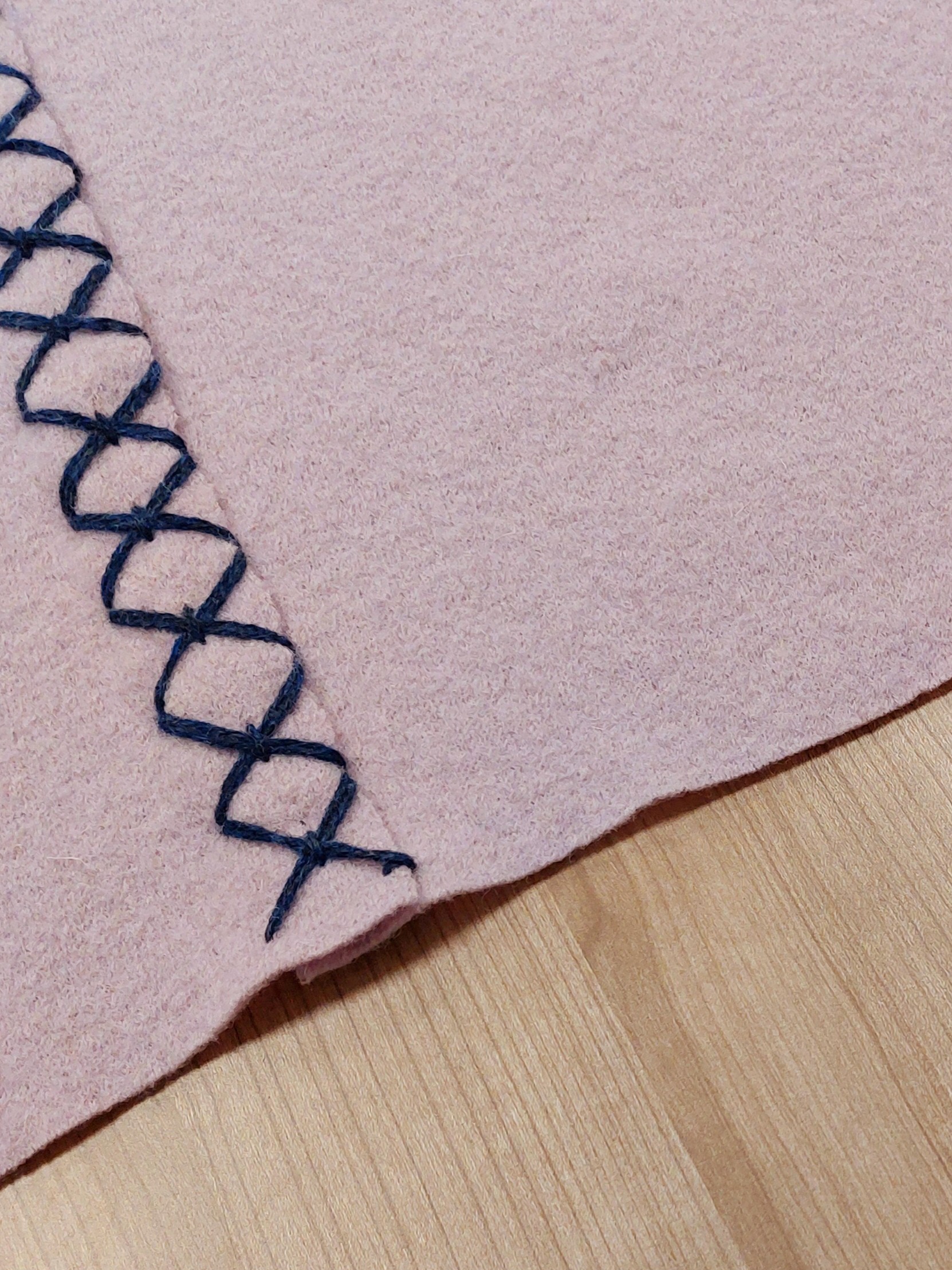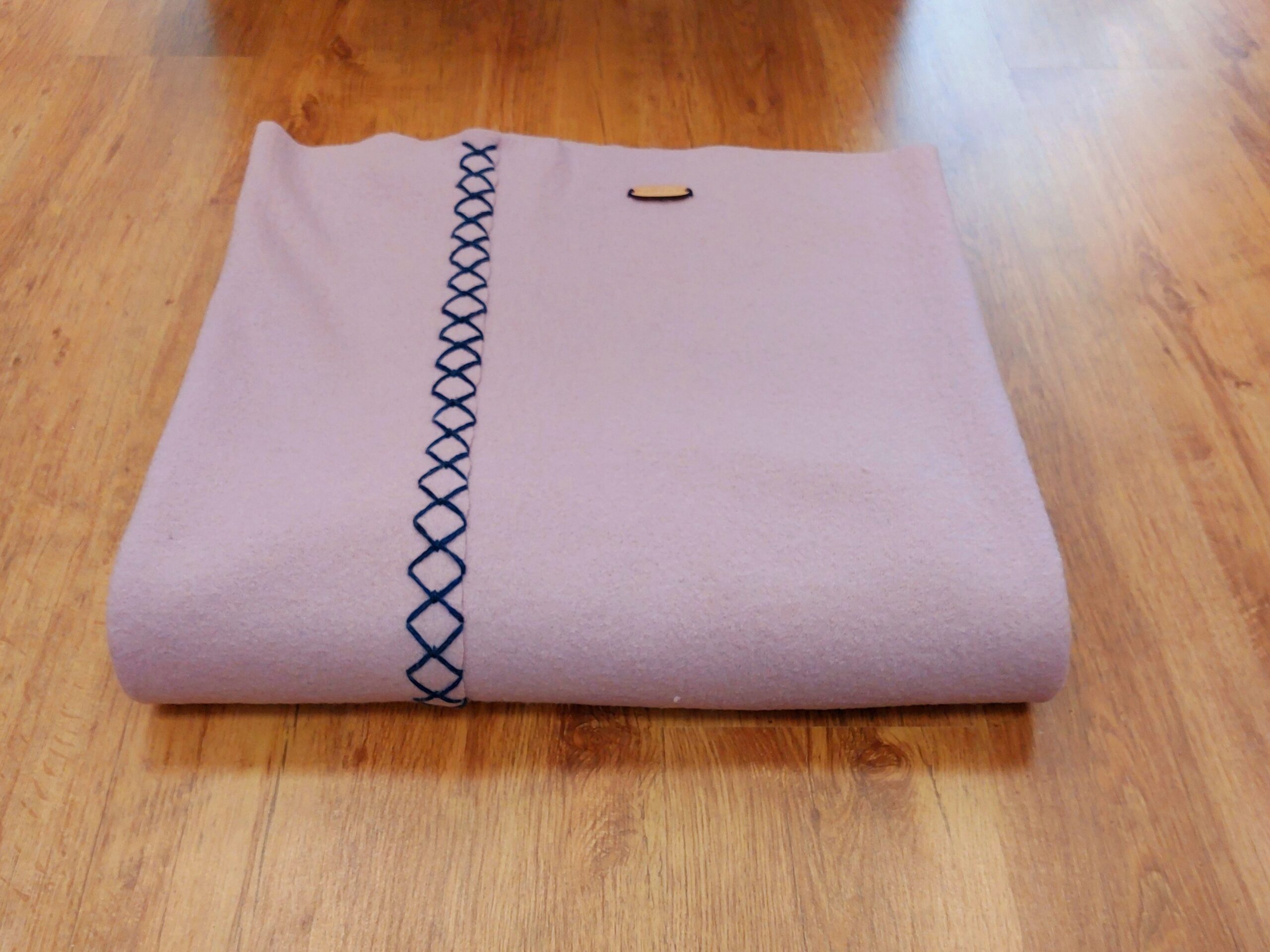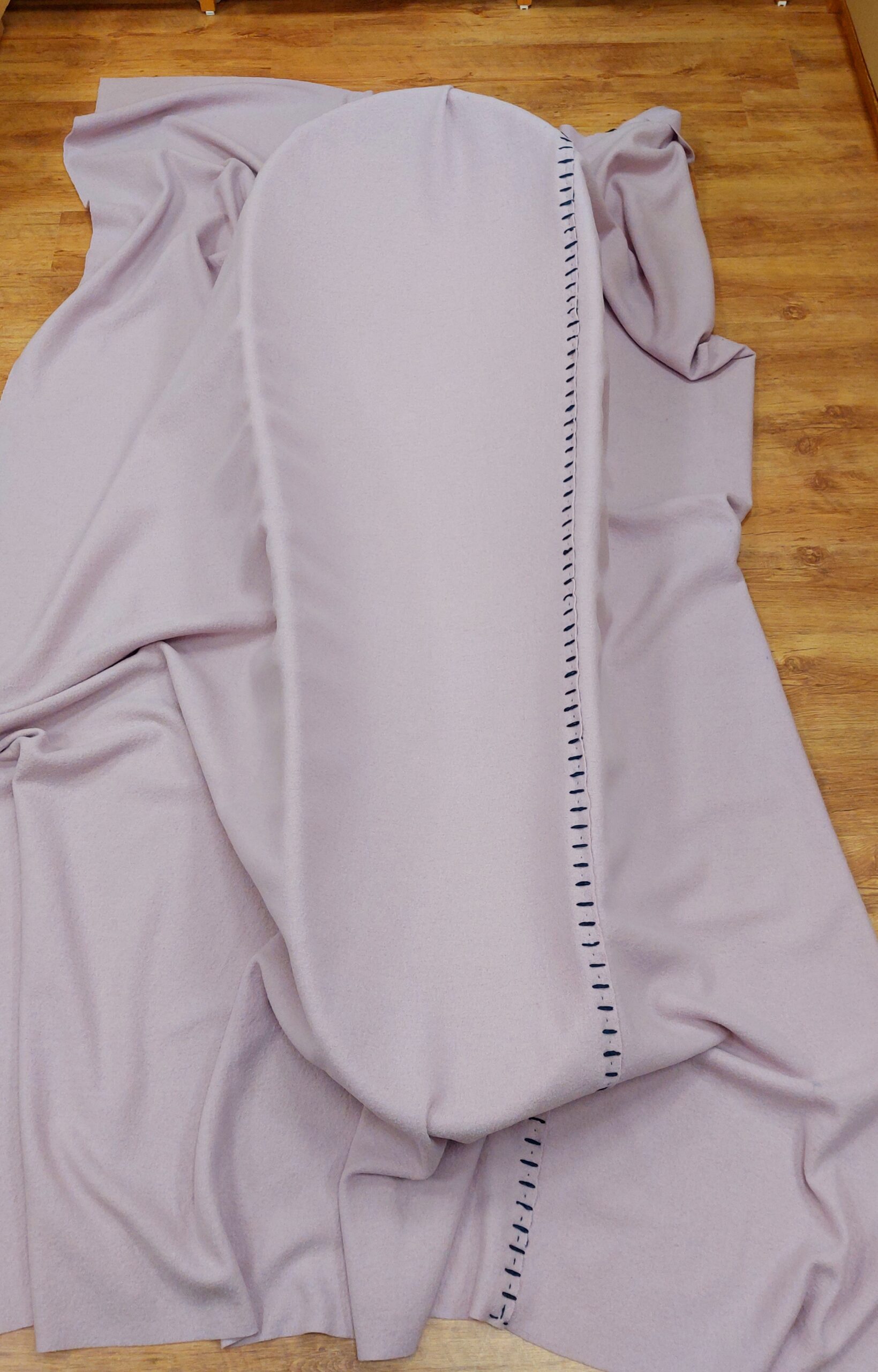 Deze zachtroze wollen wade straalt krachtige eenvoud uit. Deze wollen wade is gemaakt van een gebreide effen wollen stof die licht is vervilt. De twee banen van respectievelijk 70 en 140 cm breed zijn in de lengte aan elkaar bevestigd met een rij robuuste borduursteken in een donkerblauw gemêleerd wollen garen dat mooi contrasteert met de zachtroze wollen stof.