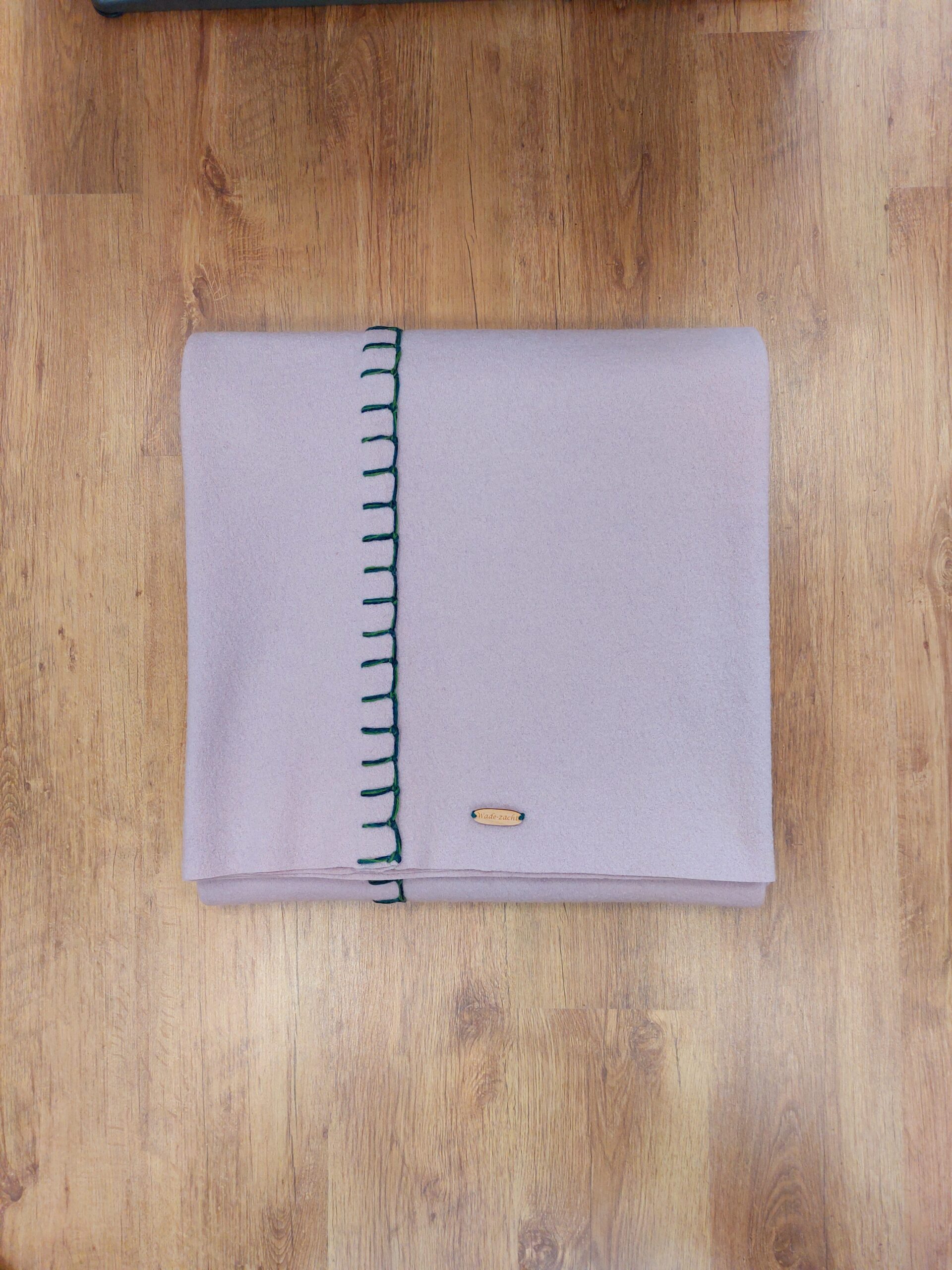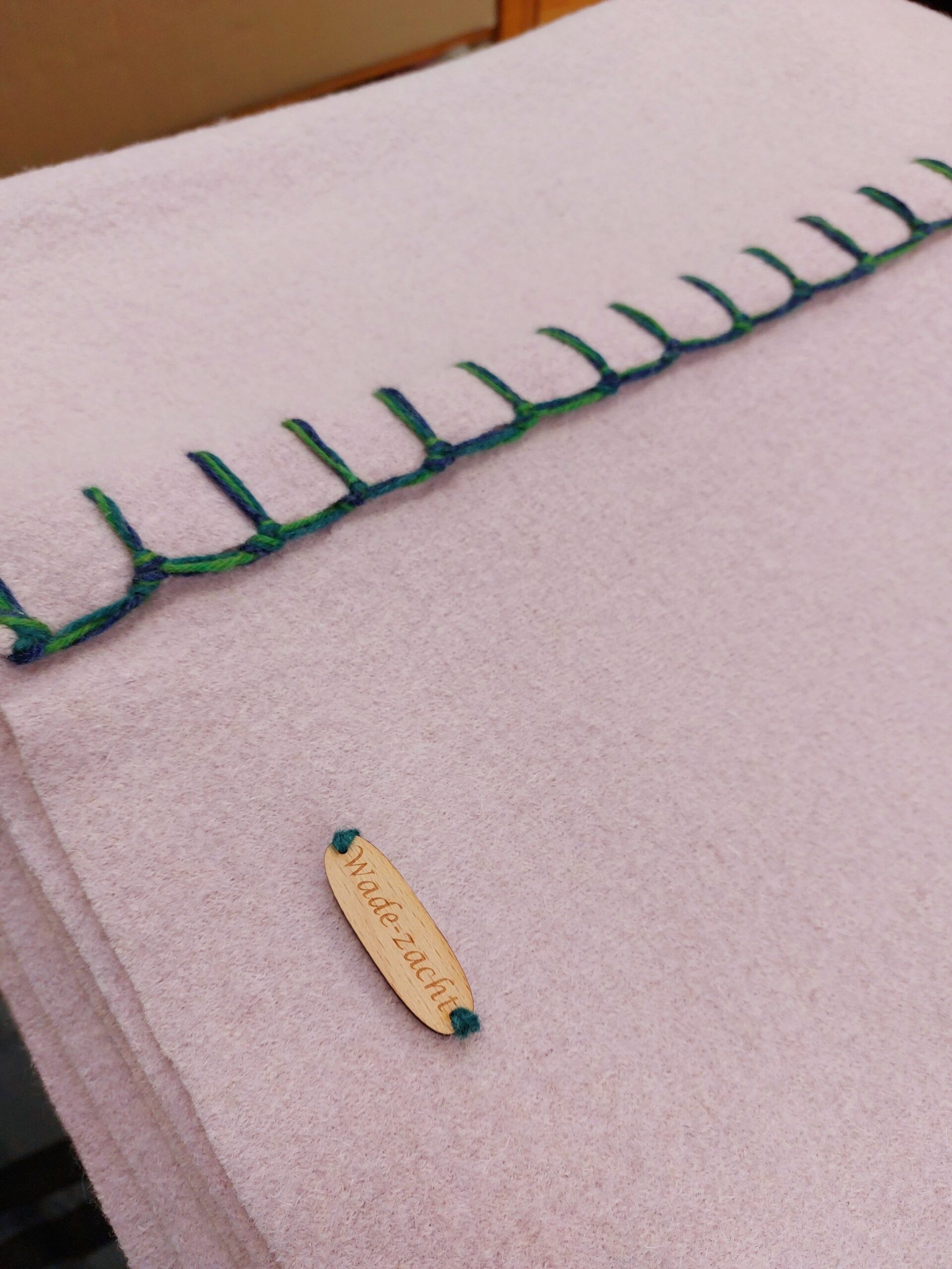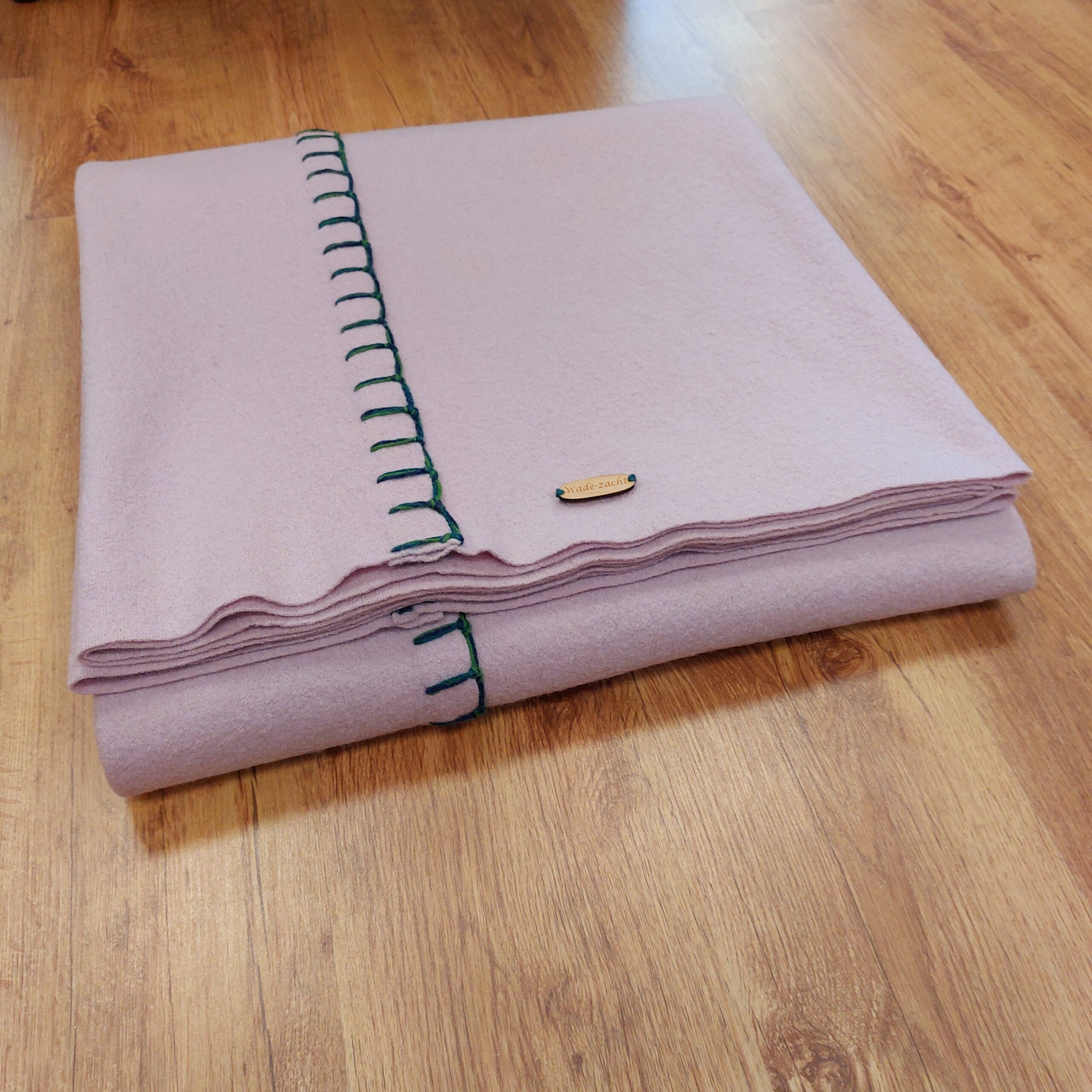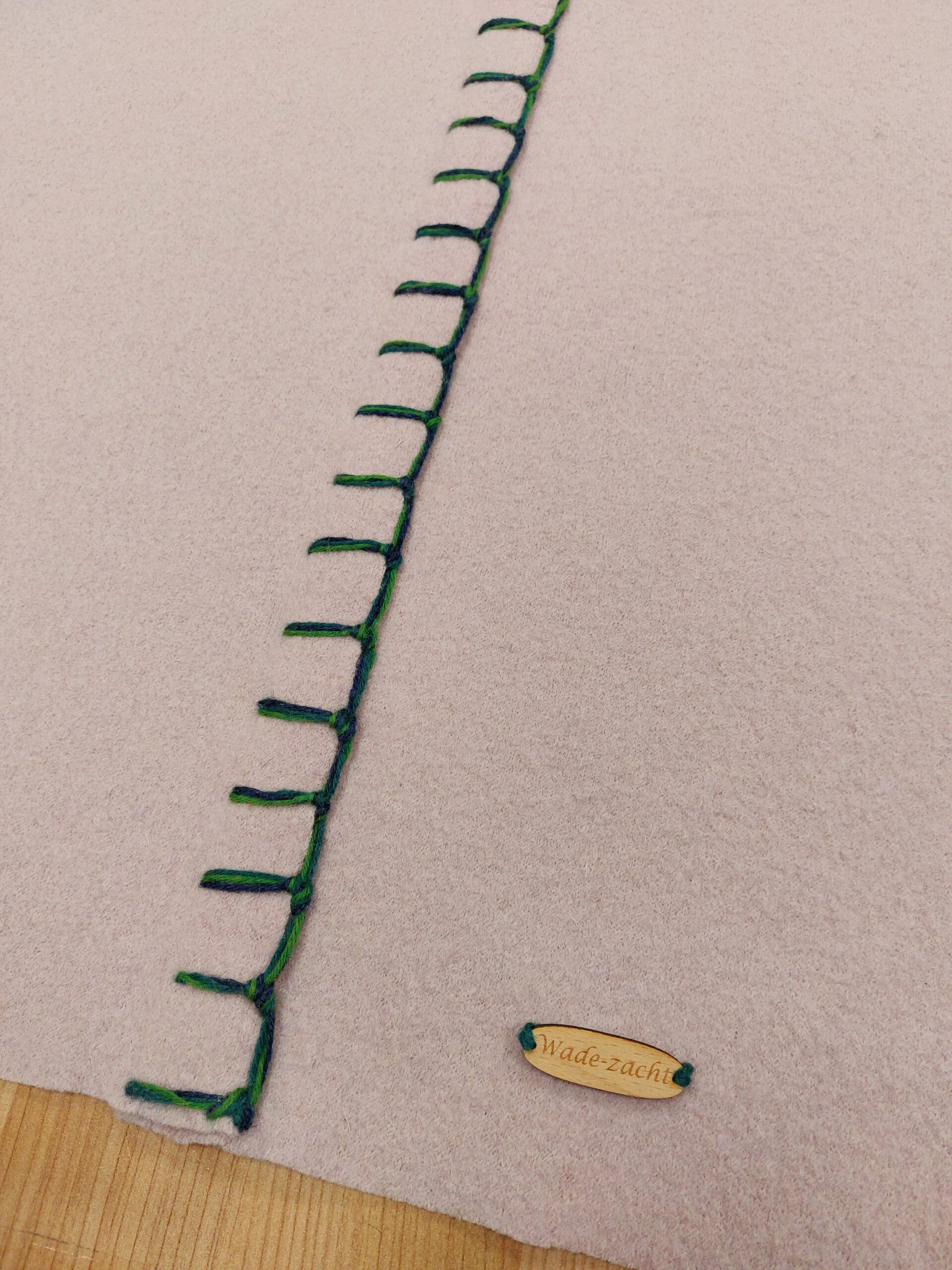Deze zachtroze wollen wade straalt krachtige eenvoud uit. Deze wollen wade is gemaakt van een gebreide effen wollen stof die licht is vervilt. De twee banen van respectievelijk 70 en 140 cm breed zijn in de lengte aan elkaar bevestigd met robuuste borduursteken in een drie tinten groen die mooi harmoniëren met de zachtroze wollen stof.