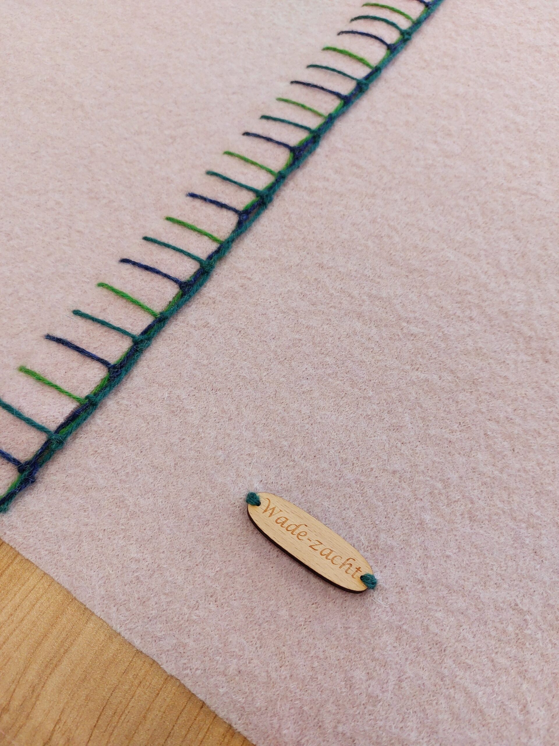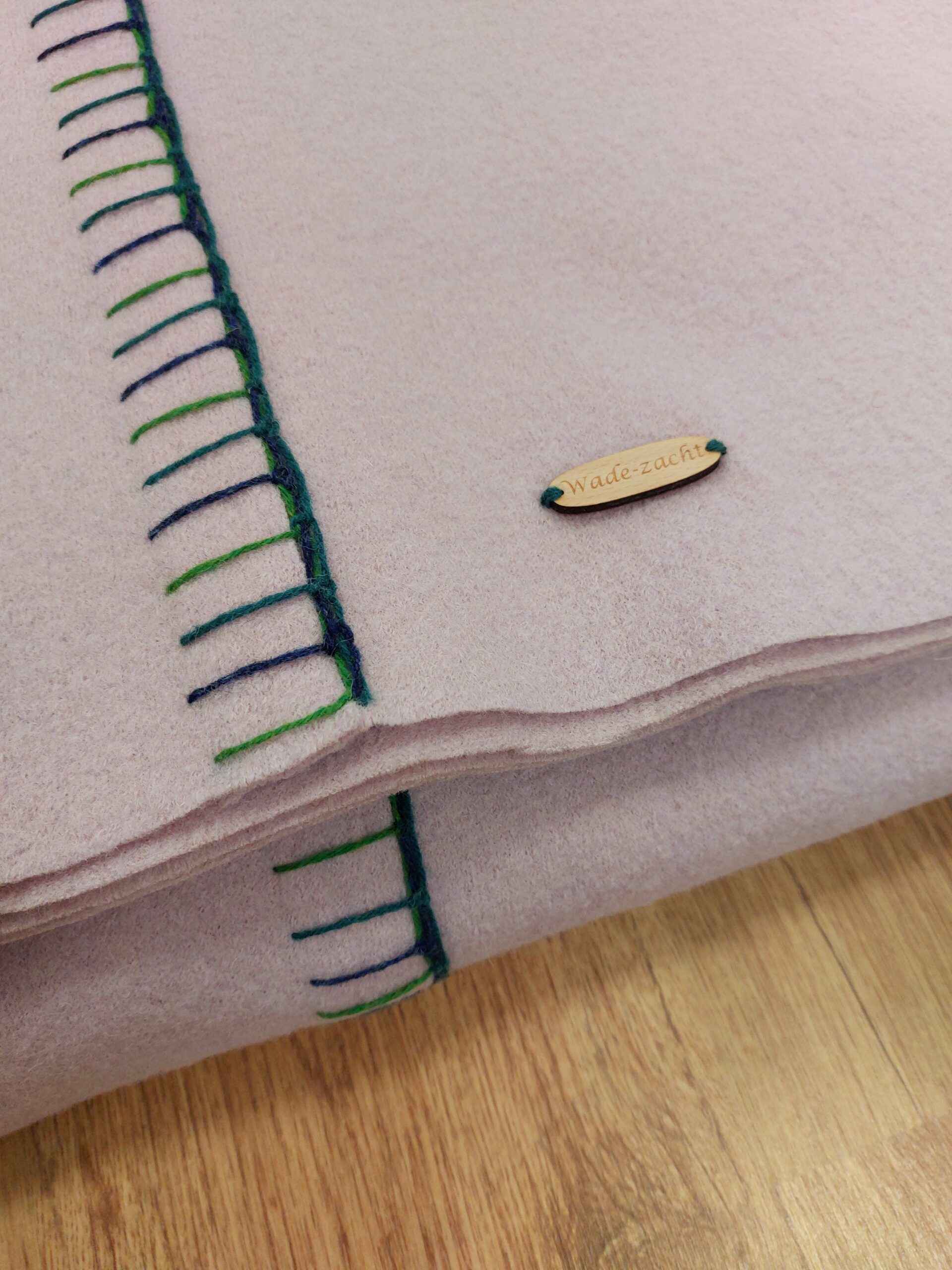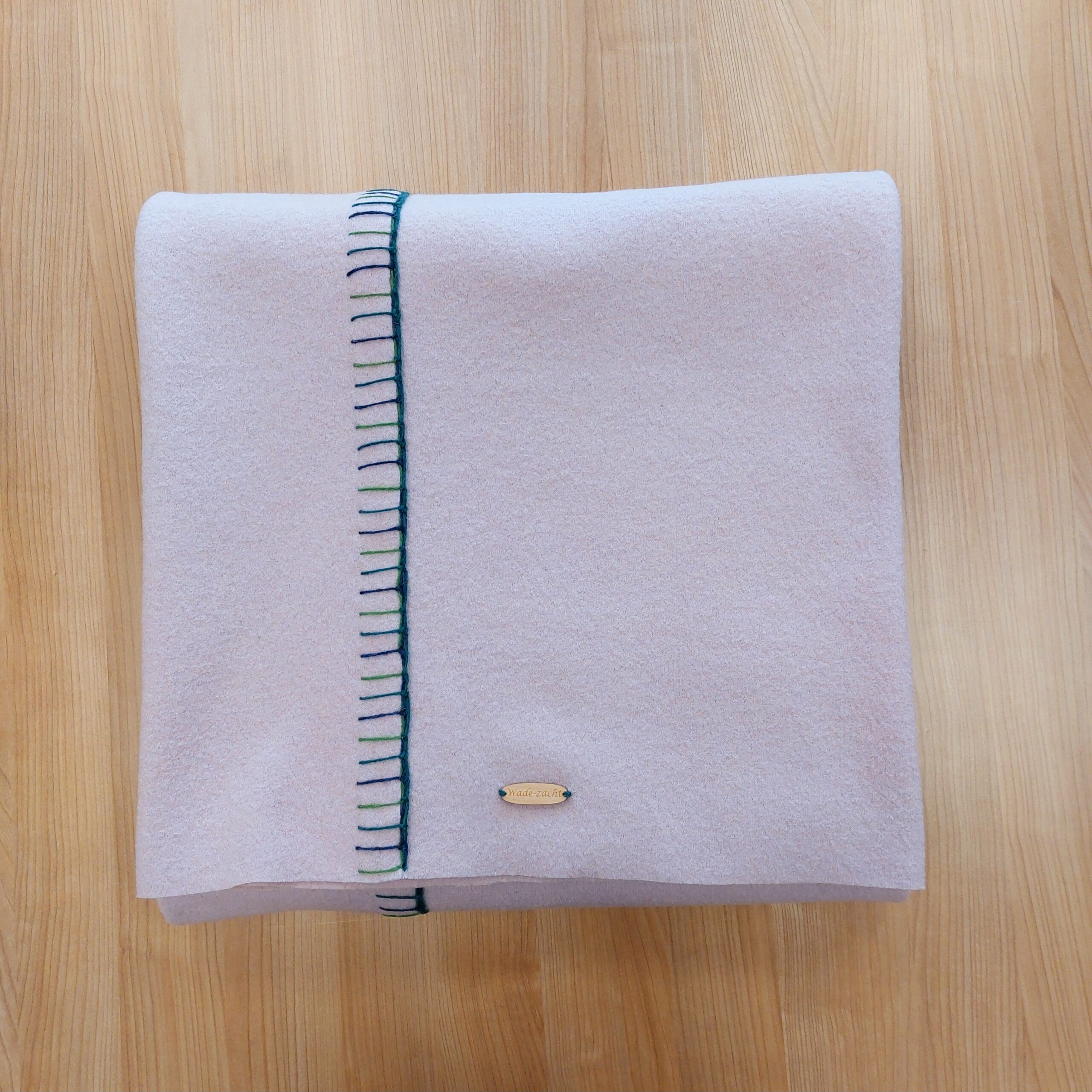 Deze zachtroze wollen wade straalt krachtige eenvoud uit. Deze wollen wade is gemaakt van een gebreide effen wollen stof die licht is vervilt. De twee banen van respectievelijk 70 en 140 cm breed zijn in de lengte aan elkaar bevestigd met robuuste borduursteken in verschillende tinten blauw en groen die mooi harmoniëren met de zachtroze wollen stof.