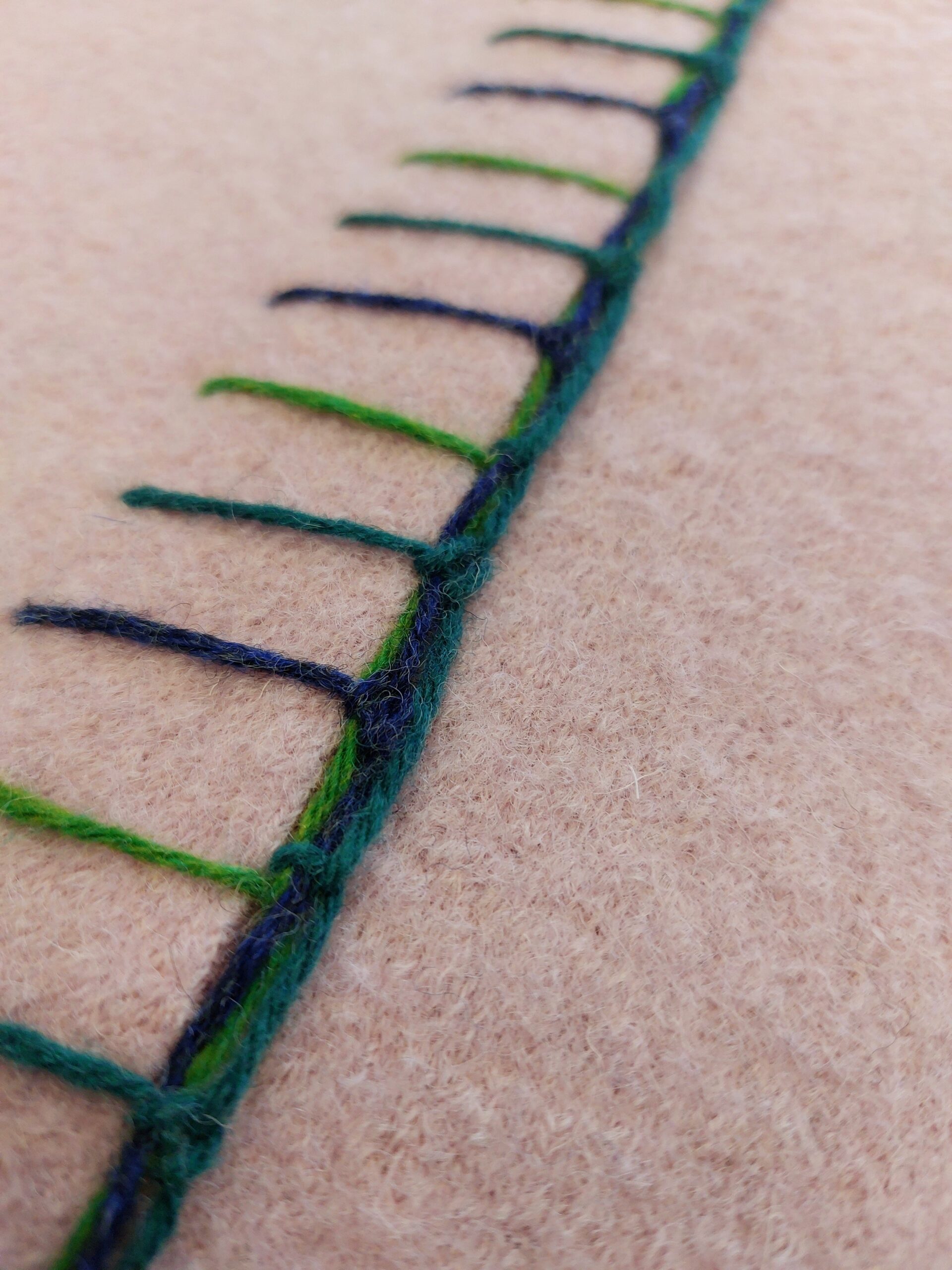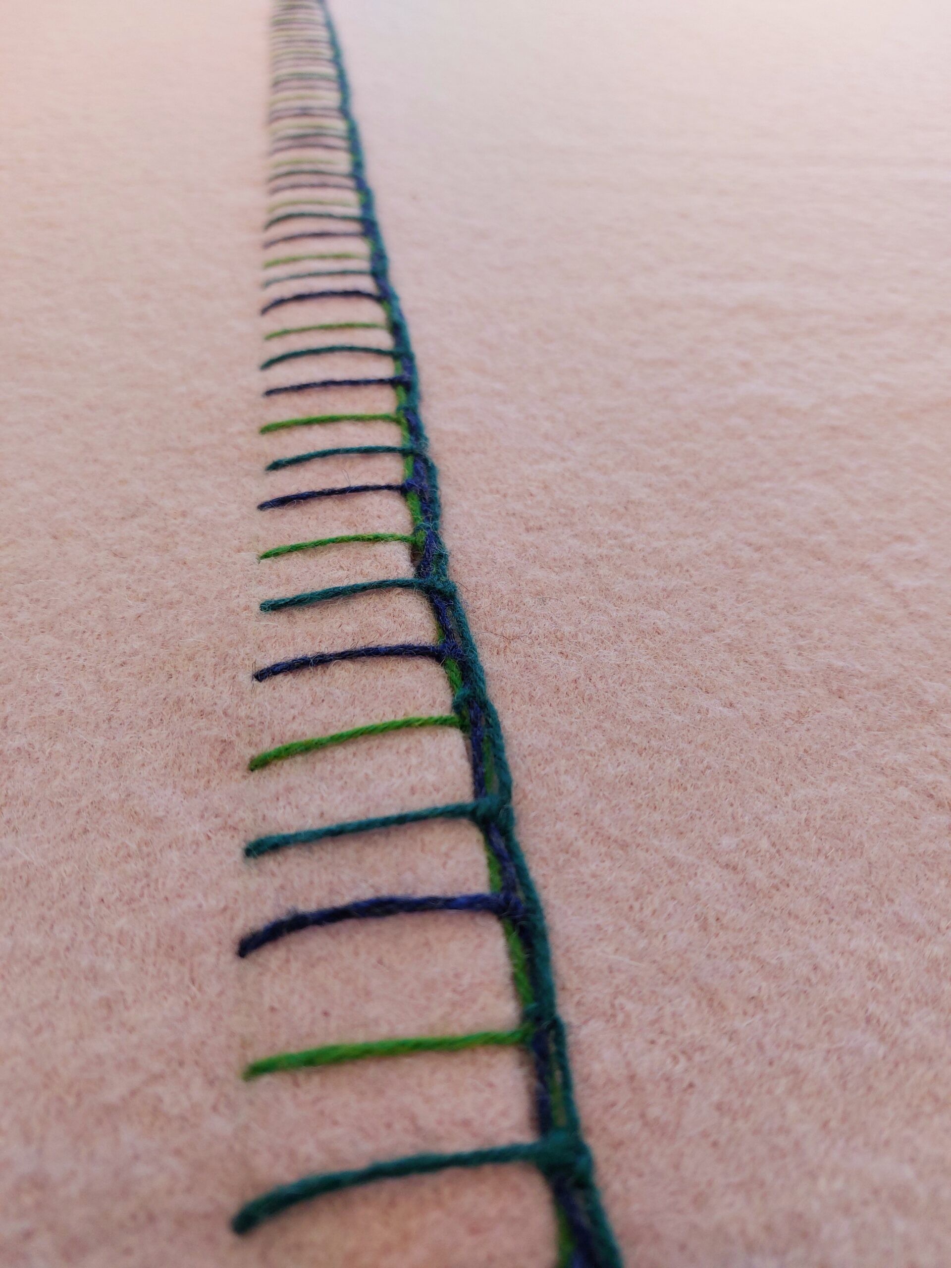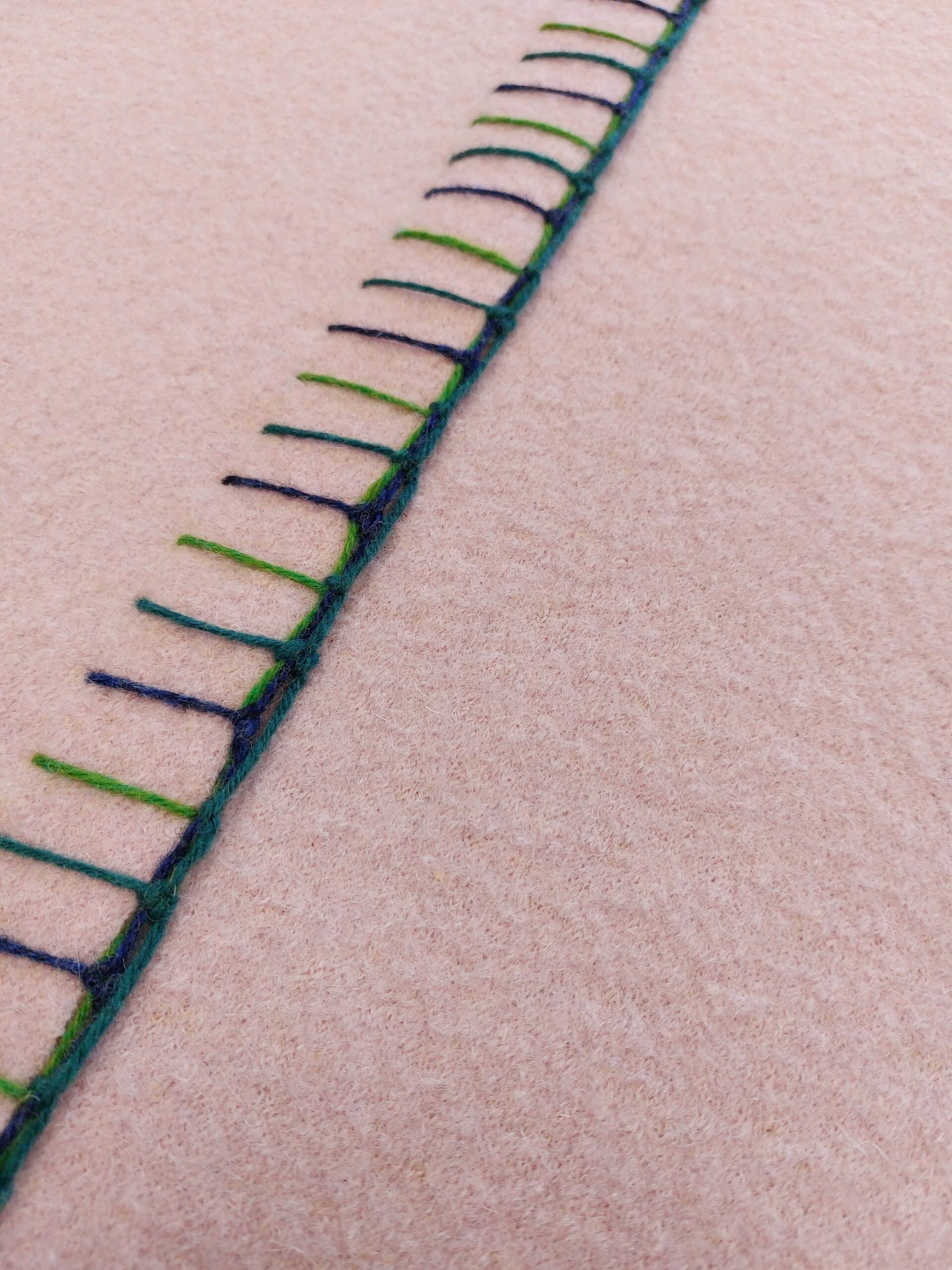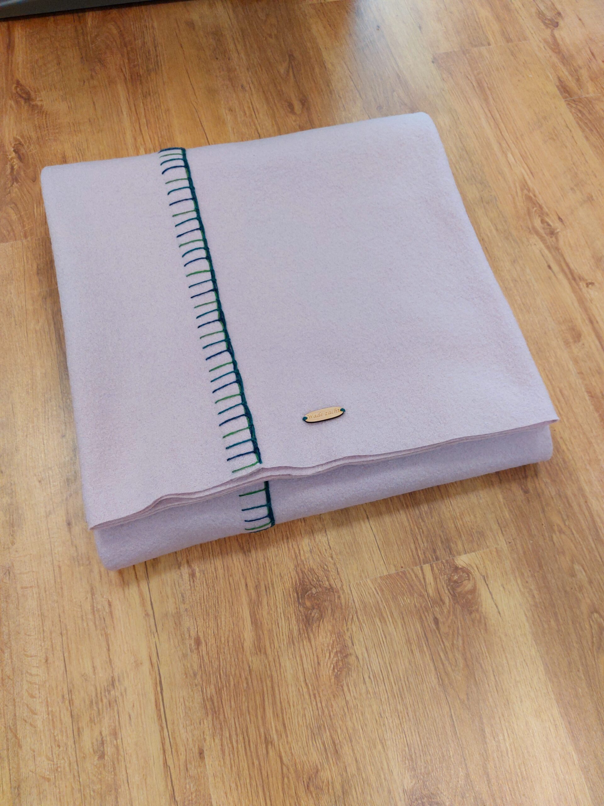 Deze zachtroze wollen wade straalt krachtige eenvoud uit. Deze wollen wade is gemaakt van een gebreide effen wollen stof die licht is vervilt. De twee banen van respectievelijk 70 en 140 cm breed zijn in de lengte aan elkaar bevestigd met robuuste borduursteken in verschillende tinten blauw en groen die mooi harmoniëren met de zachtroze wollen stof.